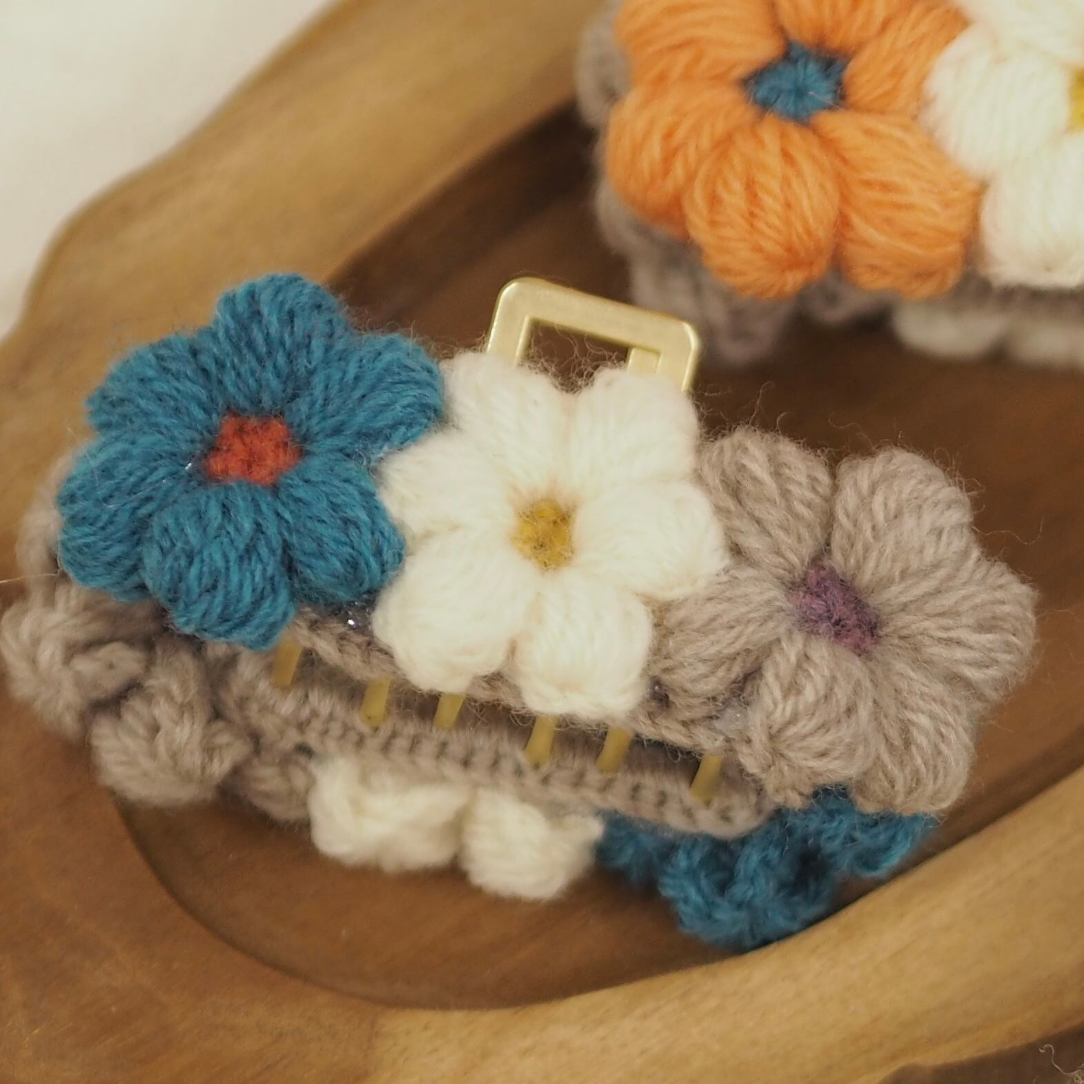 かぎ針編みでふんわりと編まれたぷっくりお花のバンスクリップ